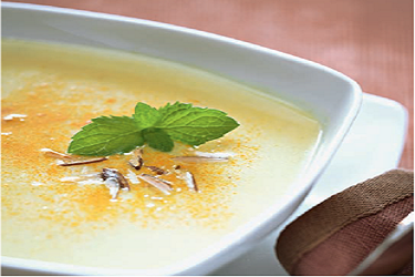Die Suppe mit getoasteten Mandelsplittern und einem Zitronenmelisseblatt garnieren.