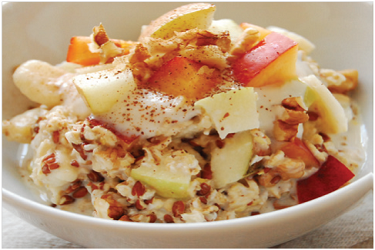 Das Getreide schroten, mit Wasser zu einem dicklichen Brei verrühren und 5–12 Stunden zugedeckt quellen lassen. Den Apfel nicht zu fein reiben, die Banane zerdrücken oder in Würfel schneiden und mit Zitronensaft vermischen. Das restliche Obst würflig schneiden, zum Apfel geben und das eingeweichte Getreide daruntermischen. Die gehackten oder gemahlenen Nüsse untermischen. Die geschlagene Sahne unter das Frischkorngericht heben (etwas für die Dekoration zurückbehalten). Mit Obst und Sahne dekoriert servieren. Wenn Sie Haferflocken verwenden, dann kann das geschrotete Getreide weggelassen werden.
