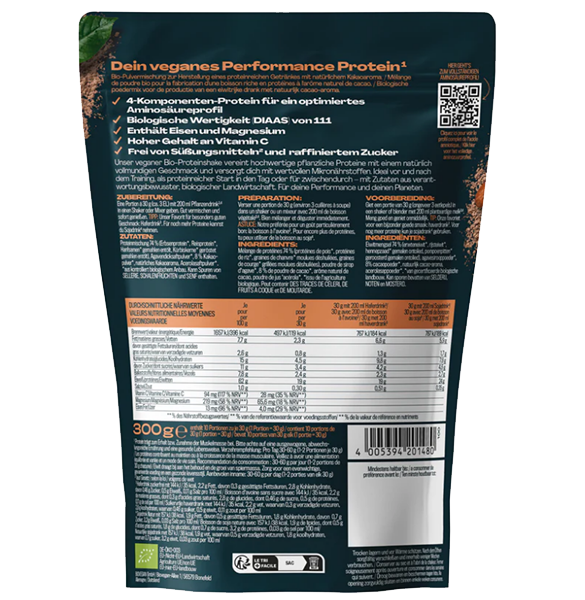 Proteinmischung 74,4 % (Erbsenprotein*, Reisprotein*, Hanfsamen gemahlen* entölt, Kürbiskern gemahlen* entölt), Agavendicksaftpulver, 8 % Kakaopulver*, natürliches Kakaoaroma, Acerolasaftpulver*