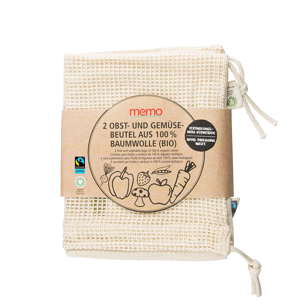 Die waschbaren memo Bio-Baumwollbeutel sind die perfekte Alternative zu Wegwerftüten aus Papier oder Plastik. Sie eignen sich besonders gut für den Einkauf von Obst, Gemüse und anderen losen Lebensmitteln wie Nüssen. Beispielsweise passen bis zu 3 kg Kartoffeln in eine der Tragetaschen und auch deren Aufbewahrung zuhause ist mit ihnen kein Problem. Eine Beutelseite hat eine luftige Gitterstruktur, die glatte Seite sorgt für hohe Stabilität. Über die praktische Zuziehkordel sind sie schnell, einfach und effektiv geschlossen. Das Gewicht des Beutels (abzugsfähiges TARA) ist auf der Innenseite abgedruckt. Die verschiedenen Siegel wie GOTS, Grüner Knopf und Fairtrade Cotton belegen die Umwelt- und Sozialverträglichkeit.