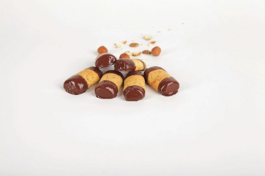 Mehl, Kamutmehl und Backpulver auf eine Arbeitsfläche geben und mit den Haselnüssen vermischen. Butter in Würfel schneiden, mit Zucker, Ei, geriebener Orangenschale, Rum und Salz verkneten, zusammen mit dem Mehlgemisch zu einem glatten Teig verarbeiten und zu einer Rolle formen. Den Teig zugedeckt im Kühlschrank etwa 30 Minuten ruhen lassen. Aus der Teigrolle Kugeln formen (10 g), daraus kleine Rollen walken. Auf ein mit Backpapier ausgelegtes Backblech geben und im vorgeheizten Backofen hellbraun backen. Die Kekse auskühlen lassen und in flüssige Bitterschokolade tauchen, auf ein Backpapier legen und trocknen lassen.