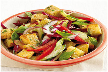 Den Salat waschen, in Stücke zupfen und in eine Schüssel geben. Die Tomaten in Stücke schneiden, Peperoni in Streifen schneiden, Gurken in Scheiben schneiden. Die Zucchini in Stifte hobeln und alles mit dem Salat mischen. Das Vollkornbrot in mittlere Würfel schneiden und in einer Pfanne mit Butter leicht bräunen. Aus den restlichen Zutaten eine Salatsauce bereiten und den Salat damit anmachen. Zum Schluss die Brotwürfel unterheben.