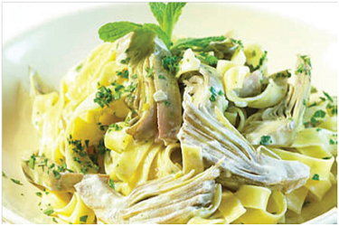 Artischocken putzen, halbieren und über einem Siebeinsatz dämpfen. Dann in kleinere Stücke schneiden. Knoblauch pressen und im Fett ganz leicht andünsten. Die Artischocken dazugeben, etwas andünsten und mit Weißwein löschen. Sahne aufgießen, salzen und pfeffern und die Soße ca. 5 Min. leicht köcheln lassen. Zum Schluss die Petersilie dazugeben und die gekochten Nudeln mit der Soße mischen.
