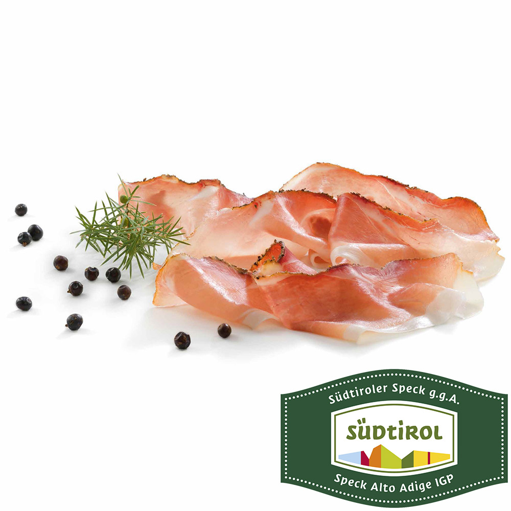 BIO Südtiroler Speck. Schinkenspeck, Keule vom Schwein ausgelöst, gesalzen, luftgetrocknet, würziger, delikater, leicht rauchiger Geschmack.