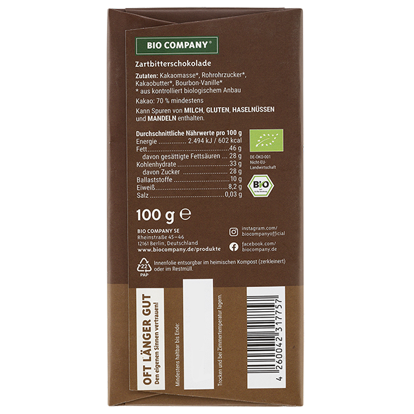 Kakaomasse*, Rohrohrzucker*, Kakaobutter*, Bourbon-Vanille*, Kakao: 70 % mindestens