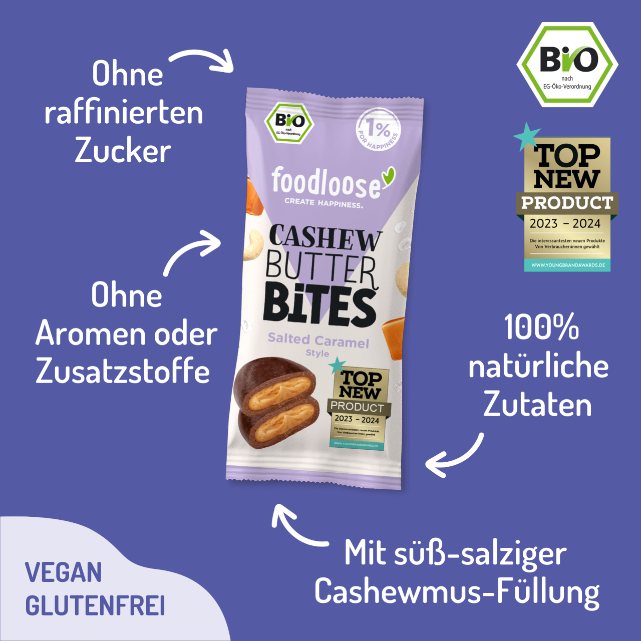Chi non ama la combinazione di dolce e salato? Il Salted Caramel rivisitato: un ripieno dolce-salato di crema di anacardi che si scioglie in bocca, racchiuso in un delizioso guscio di datteri, fiocchi d’avena senza glutine e cacao. La nota caramellata dei nuovi Bites è data dallo zucchero di fiori di cocco.