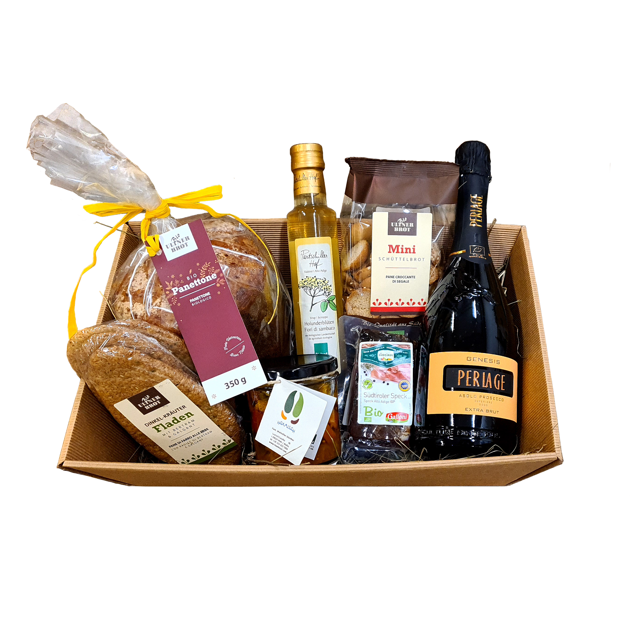 La cassetta aperitivo con deliziose specialitá altoatesini e una bottiglia di Prosecco!