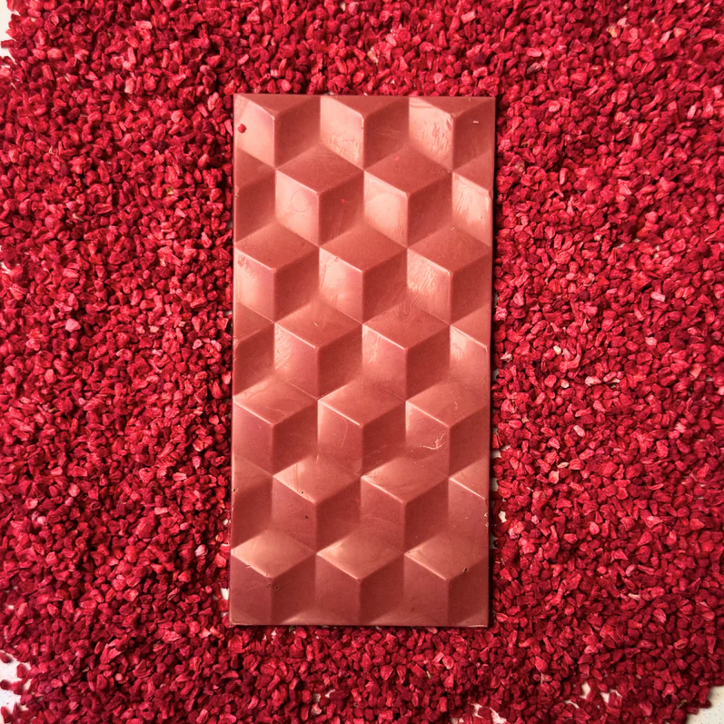 Più fruttato di così non si può. Questa tavoletta ha lo stesso sapore di un boccone di lamponi maturi. Ma è più fruttata e acidula che zuccherina. È di un bel rosa e profuma di frutti rossi. E la cosa migliore è che non contiene zucchero industriale. La dolcezza proviene esclusivamente dalla frutta.