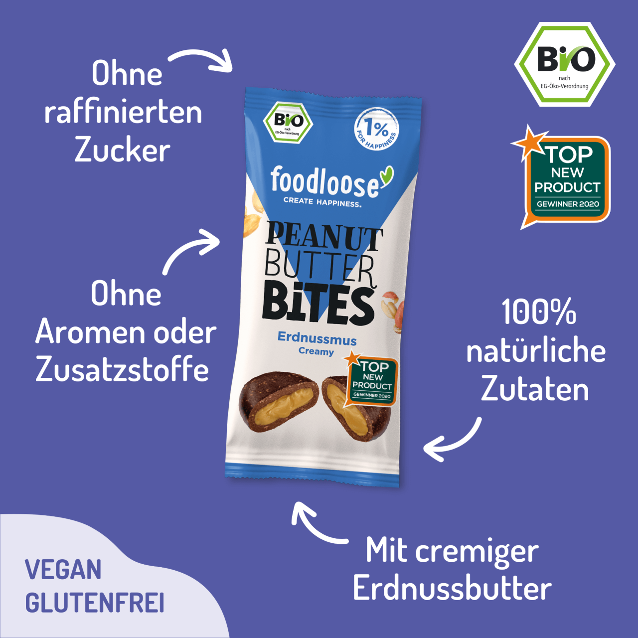 Un delicato guscio di datteri succosi, arachidi tostate e un tocco di cacao racchiude un cuore cremoso di burro d’arachidi bio – un piccolo morso di pura felicità! Perfetti come carica di energia in ufficio, snack dolce dopo l’allenamento o semplice momento di piacere durante la giornata: i Peanut Butter Bites sono il compagno ideale per ogni occasione. 100% biologici, vegani, senza glutine e privi di additivi – ma ricchi di gusto e con la coscienza pulita.