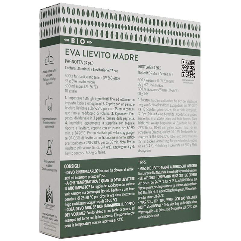Il lievito madre essicato "EVA" del Molino Merano è certificato biologico e puramente naturale. È perfetto per pane, pizza, focacce e impasti dolci. Garantisce una saporita scioglievolezza dell'impasto e richiede un tempo di lievitazione di circa 14 ore. Ideale per preparare l'impasto la sera o la mattina per la sera!